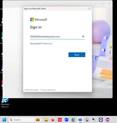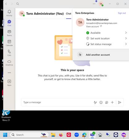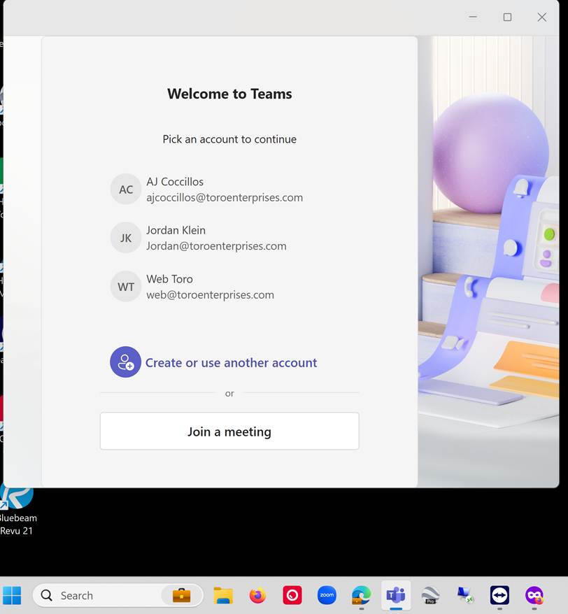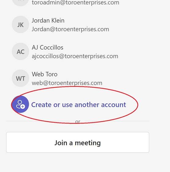 Click the Teams Icon on the Start Bar. If your email is not listed, select Create or use another account.
